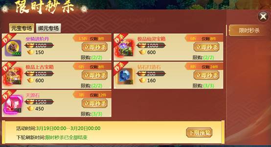 【活动内容】定时开启后,玩家可以通过限时低价秒杀超值道具,单服单次限量,售完即止