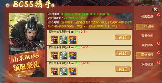 【活动内容】活动期间内参与击杀个人boss(5次、10次、15次、20次),击杀野外boss(6次、12次、20次、25次)都会有相应奖励