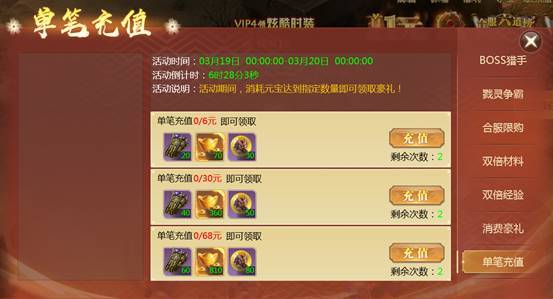【活动内容】活动期间内,单笔充值指定金额即可领取对应奖励,多次充值金额不累加