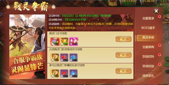 活动内容:合服第3天将会开启灵阁争霸活动,参与活动的上仙都可以获得1神器宝箱2、大量银币奖励。。