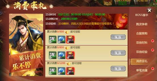 【活动内容】活动期间内玩家只要消耗元宝达到指定数量即可领取豪礼