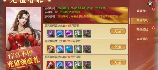 活动期间,单笔充值对应金额可领取丰富奖励哦!