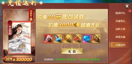 充值返大礼,活动有惊喜!活动期间,累计充值达到指定额度,便可获得丰厚奖励!