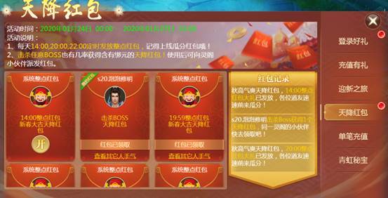 活动期间,会在每天14:00、20:00、22:00定时为大家派发大红包,记得上线瓜分红包大礼哦!此外,仙友击杀120级以上BOSS也有几率获得含有海量绑元或铜币的红包!